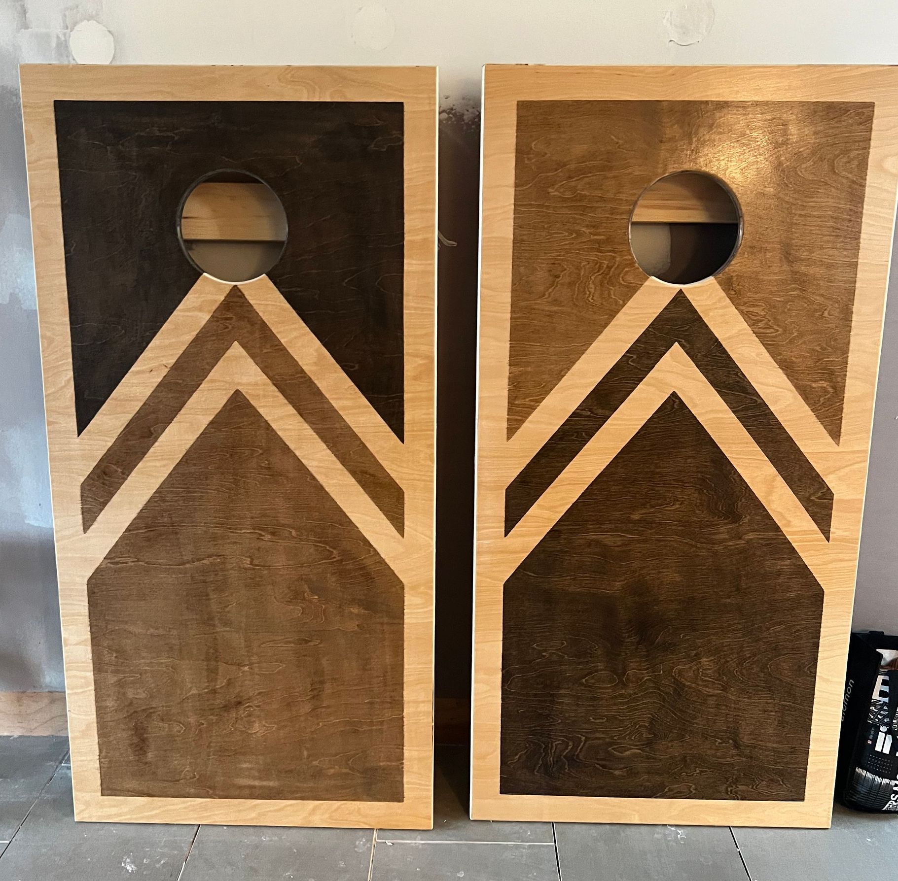 Set of Cornhole boards stained to a simple pattern and finished with poly for a slick playing surface.