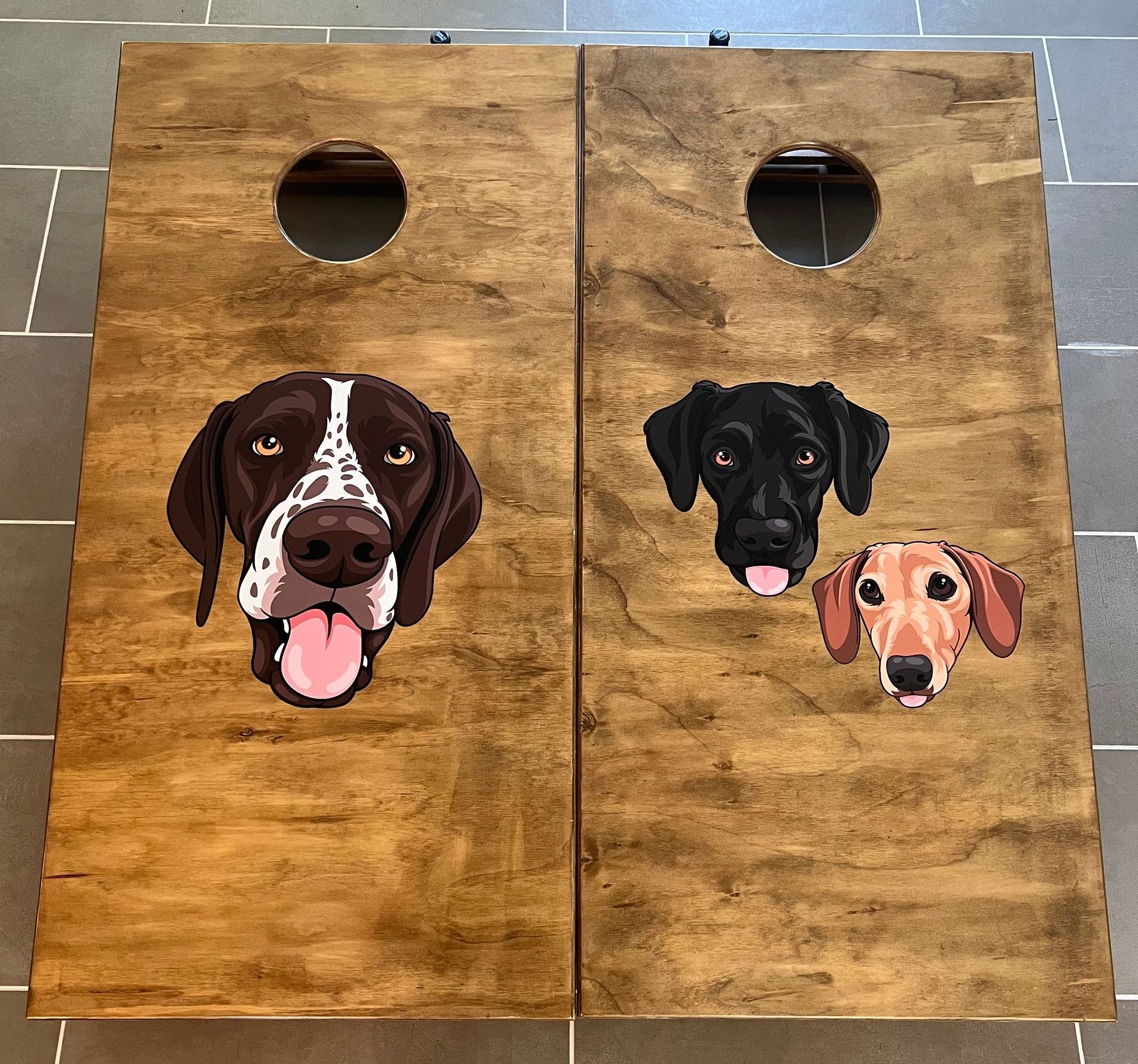 A set of custom Cornhole boards with a custom vinyl sticker on top of a stain. Finish with poly for a slick playing surface.