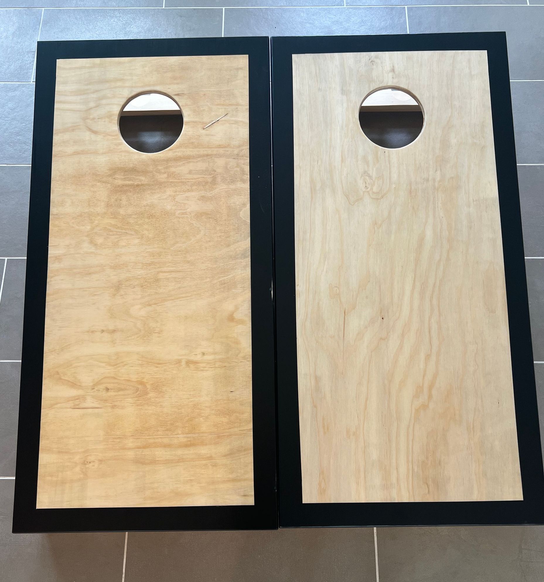A set of Cornhole board not stained and finished with poly for a slick playing surface.